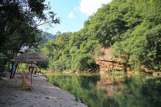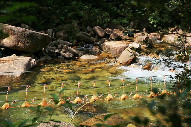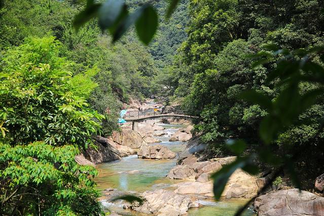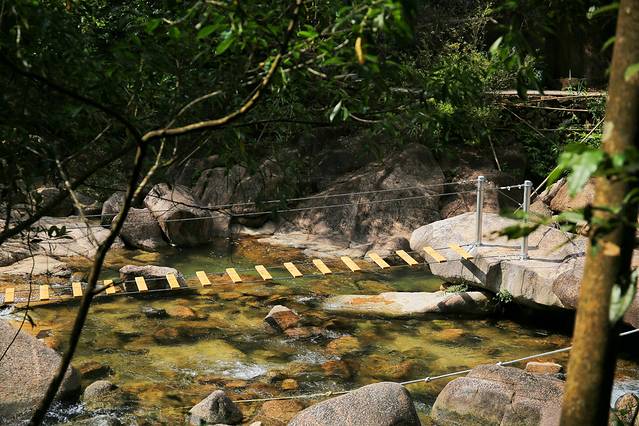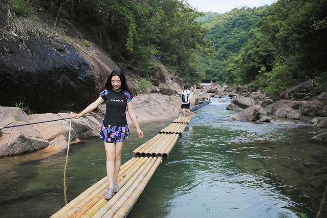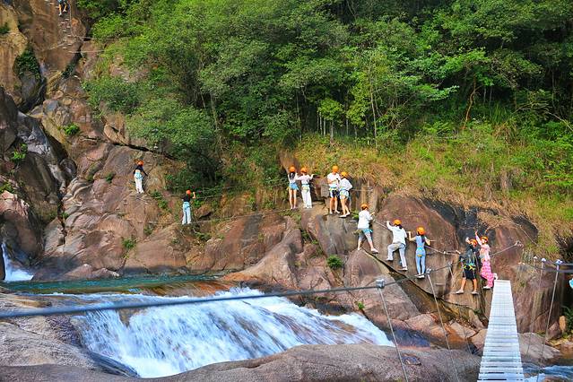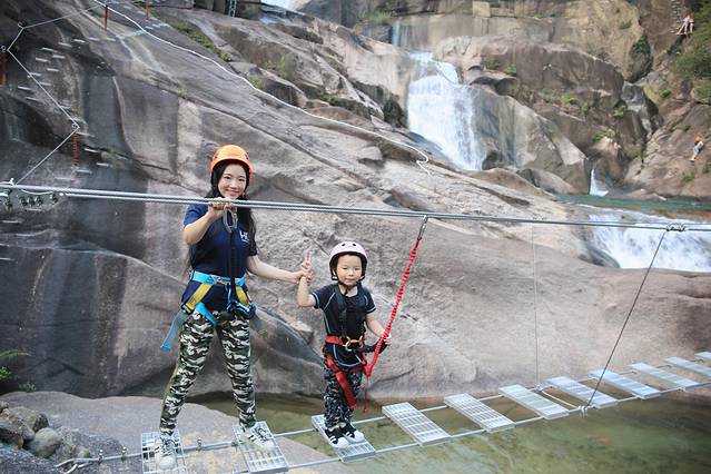 整个溯溪线路,有很多关卡设置,比如过竹排、轮胎、水上漂、走钢丝、独木桥、铃铛网等,有不同挑战难度,可以尽享丰富刺激的探险之旅,时不时停留在溪水中举目而望,满眼的绿色足可以让人洗去一身疲惫。