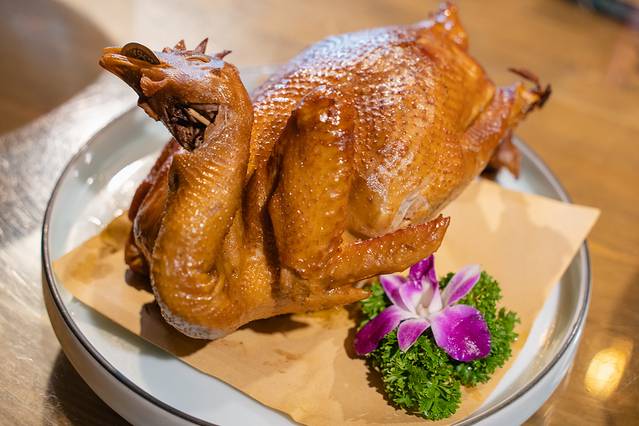 江米补参鸡:人参姜米鸡肉香嫩脱骨,糯米饭更是软糯香甜;
