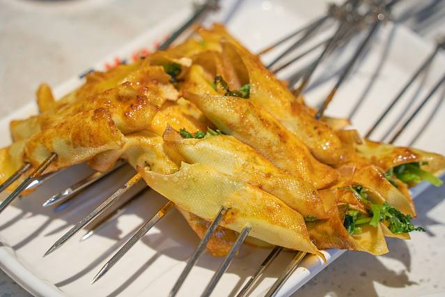 炒菜、铁锅炖都品尝过了,那么东北的烧烤也得安排一餐,玉善烧烤主打的是朝鲜族烤串,蘸碟都跟在南方吃的完全不一样,电烤炉自动转串,所以全程都能吃到热乎乎的烤串。