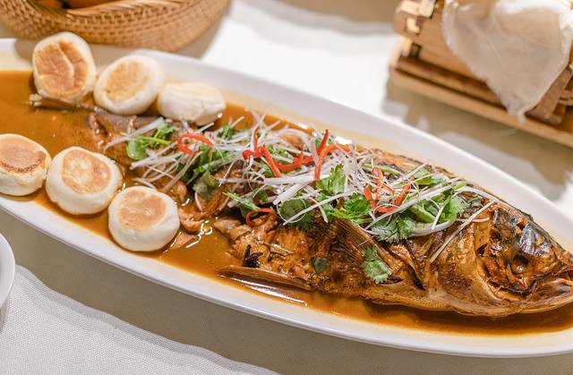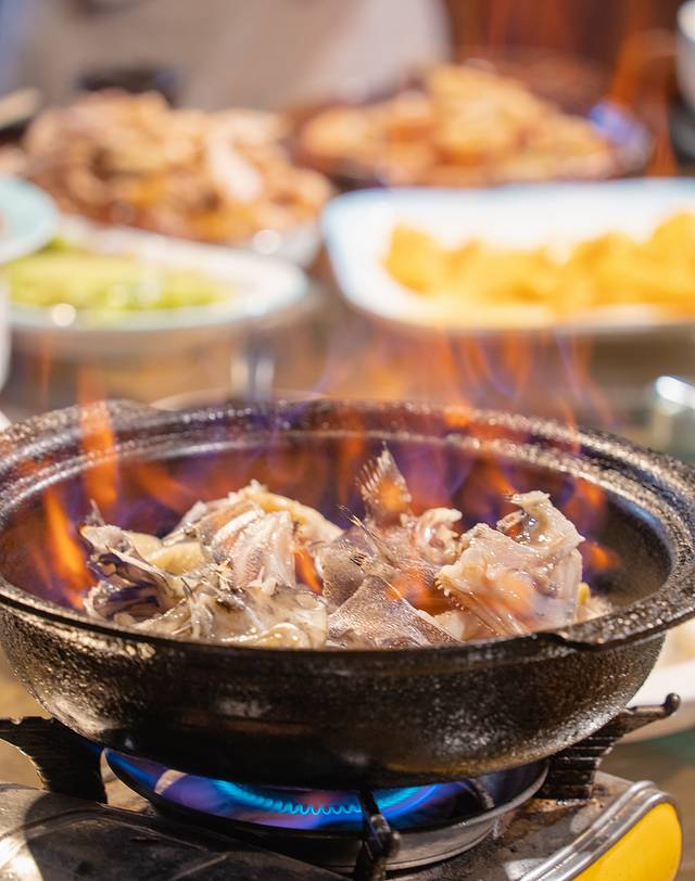 这家餐厅给人的感觉就是仪式感十足,就连上火焰焗碟鱼头都特别的有排面,高高燃起的火焰,真的太酷了。