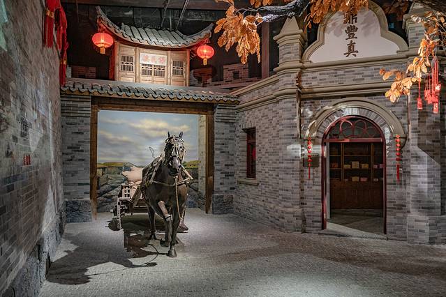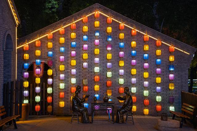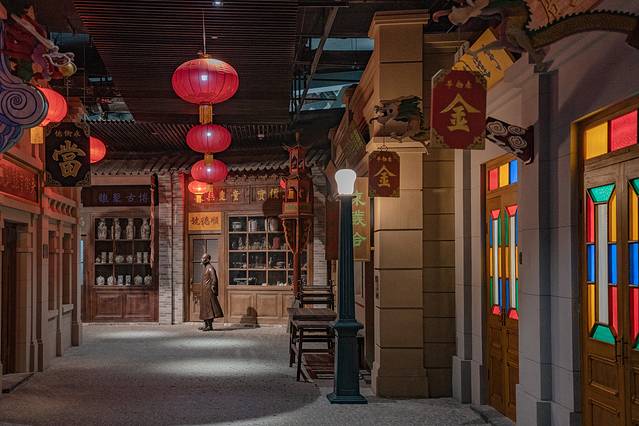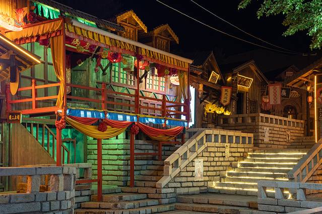 夜幕降临之后的莲花岛影视休闲文化园如进入了时空的穿越,玫瑰歌舞厅、和平饭店、东风照相馆等,让人仿佛回到了一百多年前。
