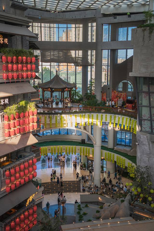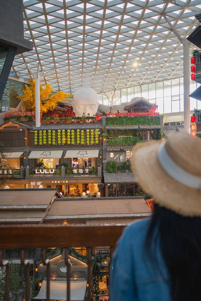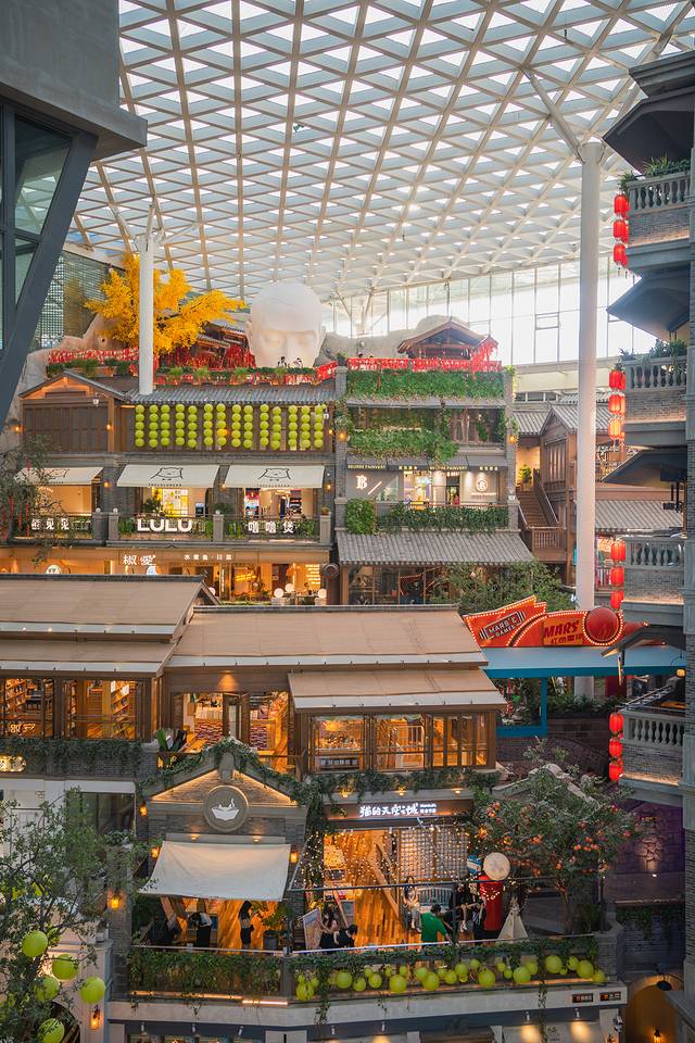 从商场大门入口处向高处走,感觉山在城中,人在山中,商场内有书店、话剧院、酒店、影院、文创、小吃街、问蟾亭等移步换景,让人感觉徘徊在这座建在商场里的“山”中,是如此的奇妙。