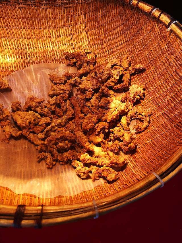 “宽面条”油炸至酥脆后,再重新入锅和各种香辛料一起翻炒