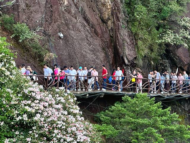 景区内有方圆数百亩的杜鹃,树龄上千年的杜鹃树比比皆是。每年五六月份花开时节,芬芳漫山,特别壮观。三清山杜鹃花开放时间因海拔不同盛开时间也不同。长在海拔500m~1km的杜鹃花在四月初至五月中旬开放。海拔1km以上的杜鹃花在五月下旬至六月上旬开放。如果你们来三清山,别错过花期哦~