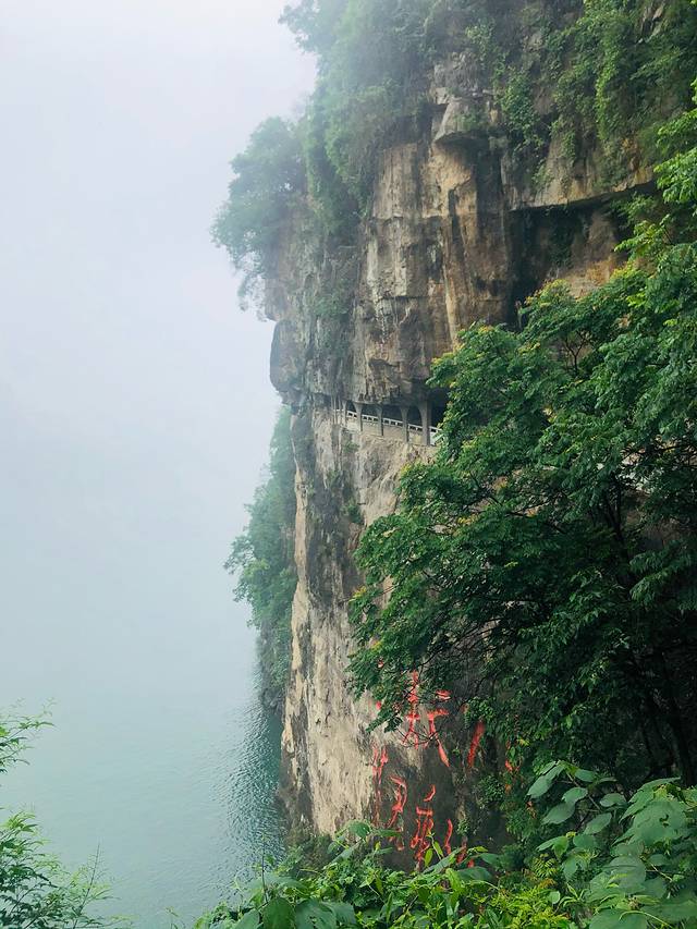 沿着山壁修建了一条栈道,是挖山而成。曲曲折折,拾级而上,就到达山头。能看到下面青青江水,和对面的山壁以及峡口。