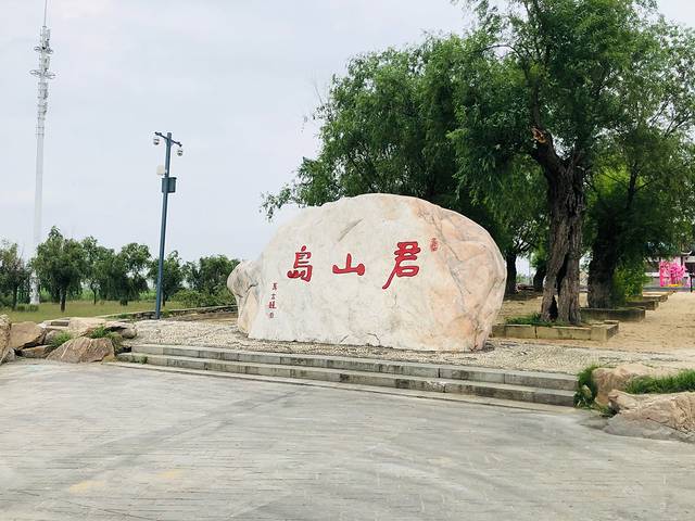 从岳阳市区到君山岛可以坐船可以坐公交。这是君山岛的景区大门外。