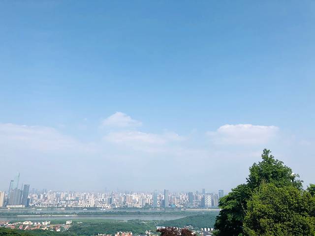 站在岳麓山顶的观景台,远眺湘江和对岸的城市天际线。