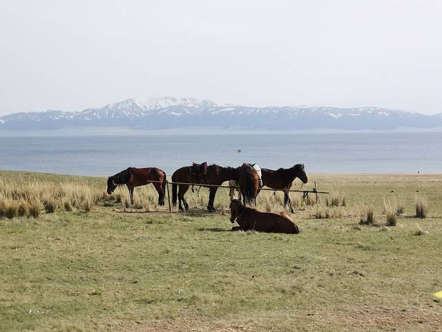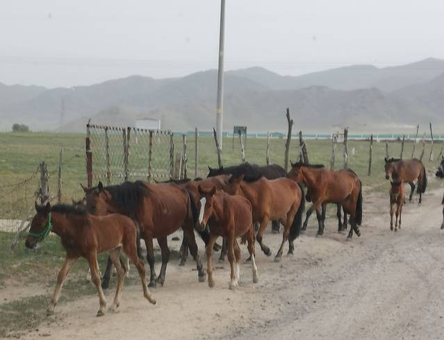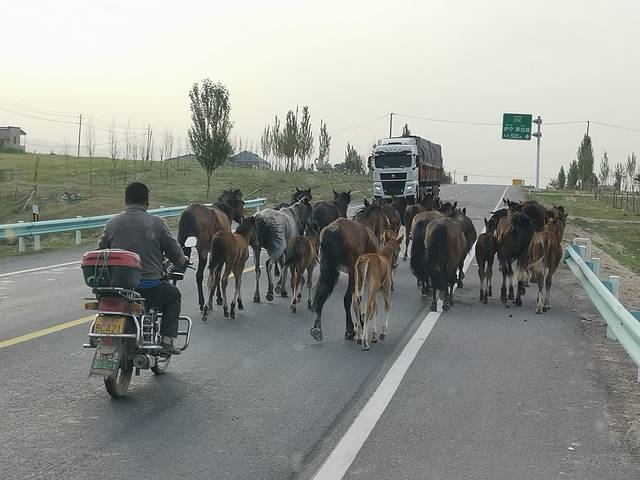 经过昭苏湿地公园,大家确定不进景区。往前一点点,看到了很多马儿牛儿在河边悠哉地吃草,应该是个牧场吧。姐妹们看着白的黑的棕的花的动物们,咔个不休。