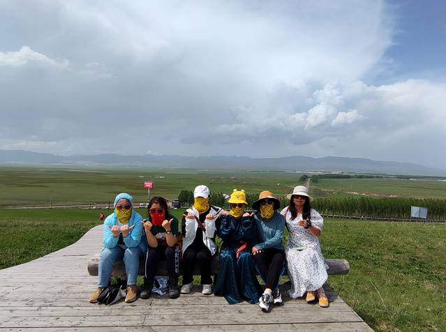 感觉坐了很久很久的车,快到巴音布鲁克的时候醒来,看见路上一群羊,忍不住尖叫。想着景区里面应该更迷人,结果下午3点钟吃完饭出来,本来晴朗的天,瞬间乌云一片片,没多久开始雷声轰隆,哗啦啦下冰雹了。4点的时候雨还没有停下来的意思,小太阳跟超市的老板讲价到15块,带大家去买鞋套。等进了景区,后来又天晴了,终究是鞋套扛下了所有。