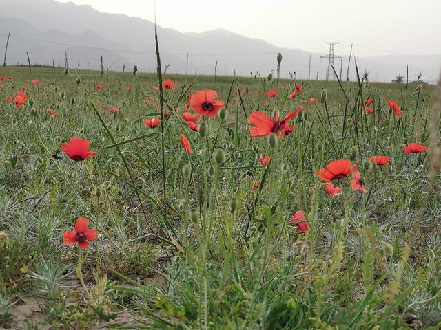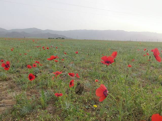 天山红花和虞美人远看很像,只是红花花心有黑色的图案,花期很短,一般是5月底6月初。我问小太阳有没人做饭吃野罂粟,她说可能没有。因为花不是很茂盛,小太阳帮我们讲价到5块钱一个人,觉得还是很幸运。