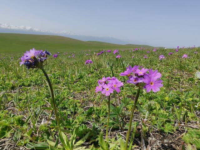 看喀拉峻的徒步路线常常有很多美图,于是我以为花海是常有常新,毕竟有鲜花台呢。但真实的喀拉峻草原,是野生的矮矮的花,毛茛几乎贴地,报春花趴着才能拍出一点点感觉。
