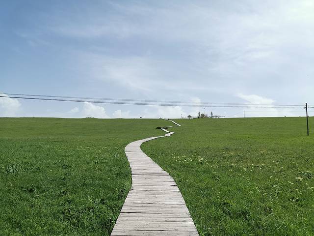 天马浴河旁边有一片平坦开阔的草原,还有敖包,四面相望,都是一镜青绿。木栈道旁很多野草莓开出了白色的花,毛茛蒲公英也很多。小太阳说拍视频的时候,我下意识地躲在最后怕入画,结果被游拍进去了,效果又意外的好。