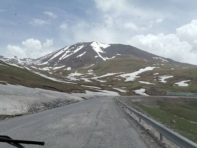到巴音布鲁克之前有一处冰雪还没有融化的地方,姐妹们都很激动,我泰然自若的坐在副驾驶,没有下车。如果单论看雪山,我还是喜欢春天的路景。