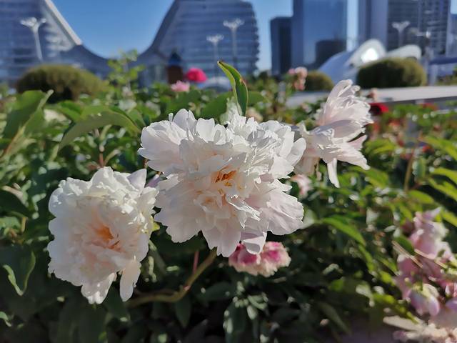亭子看着近在咫尺,但好几个岔路口,走过去又有围挡,总觉得哪里不太对。走过来走过去,被喷淋系统的水淋了一身,才找到其中一个亭子的方向。路上有金银花还有一些好看的植物,芍药开了几朵,更多的是花苞,还有一些蓝色的小小勿忘草在日光里招摇,暂时分解了我一个人的茫然。