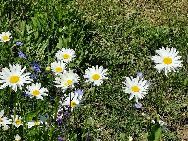葡萄架下跳舞的人们笑容满面,旁边草丛里蒲公英的小黄花、山坡上的紫色鼠尾草、蓝色的亚麻籽、粉的蔷薇、还有白色的菊花仿佛一场春日宴,令我的探路多了乐趣,一点迟疑也云开雾散。