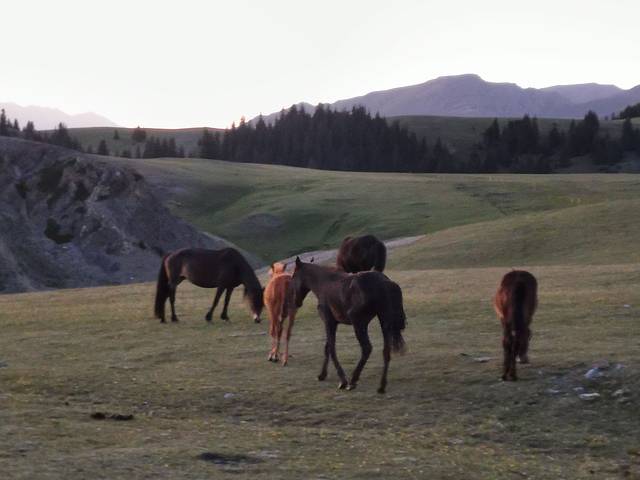 遇上的哈萨克牧民说,下去才能看见最美的风景,但是下去容易上来看着不太容易,我们很轻易地就决定走平路回去更好。也是走着走着,我发现我可能更爱昭苏的那种平坦的草更多的草原。