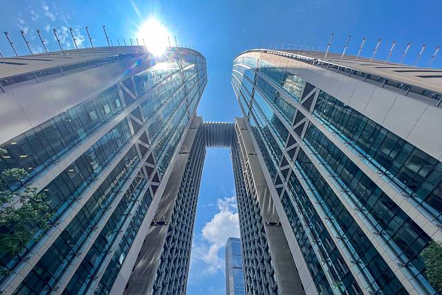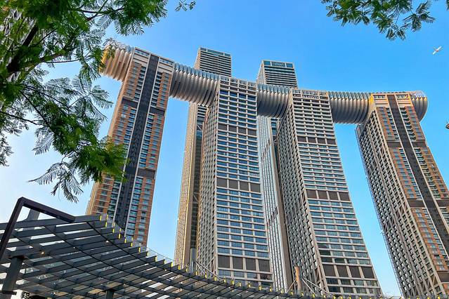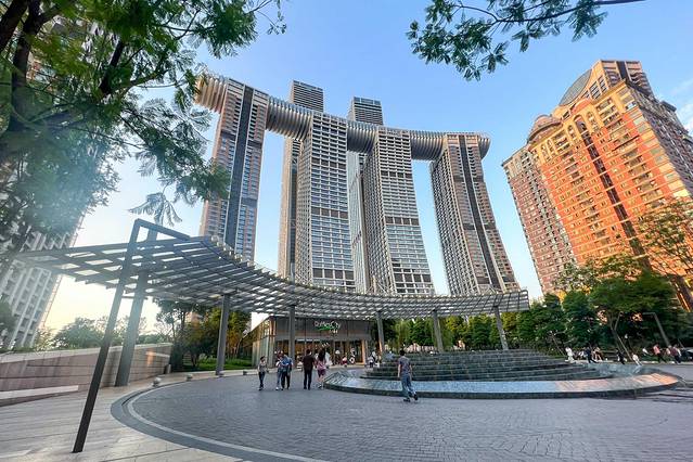 重庆来福士位于中国重庆市江北区,也是位于重庆轨道交通1号线的朝天门终点站之上,是凯德集团斥资超240亿元打造,建筑群由8 栋塔楼、底部裙楼及一座横跨天际的空中水晶连廊组成,涵盖高端住宅、购物中心、办公楼、酒店、服务公寓和水晶连廊六大核心业态,独有的水晶连廊包括探索舱·云端乐园、俱乐部、水晶连廊餐厅及酒吧。