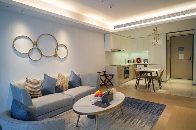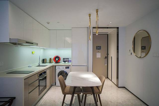 我这次的入住的一房套房内就有独立的厨房、客厅、卧室、卫生间以及步入式衣帽间。房里厨具齐全,有微波炉、烤箱、洗碗机。除此之外,房间内还配备了洗衣机、胶囊咖啡机等等,特别有家的感觉。