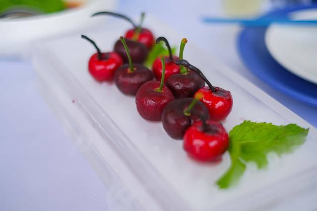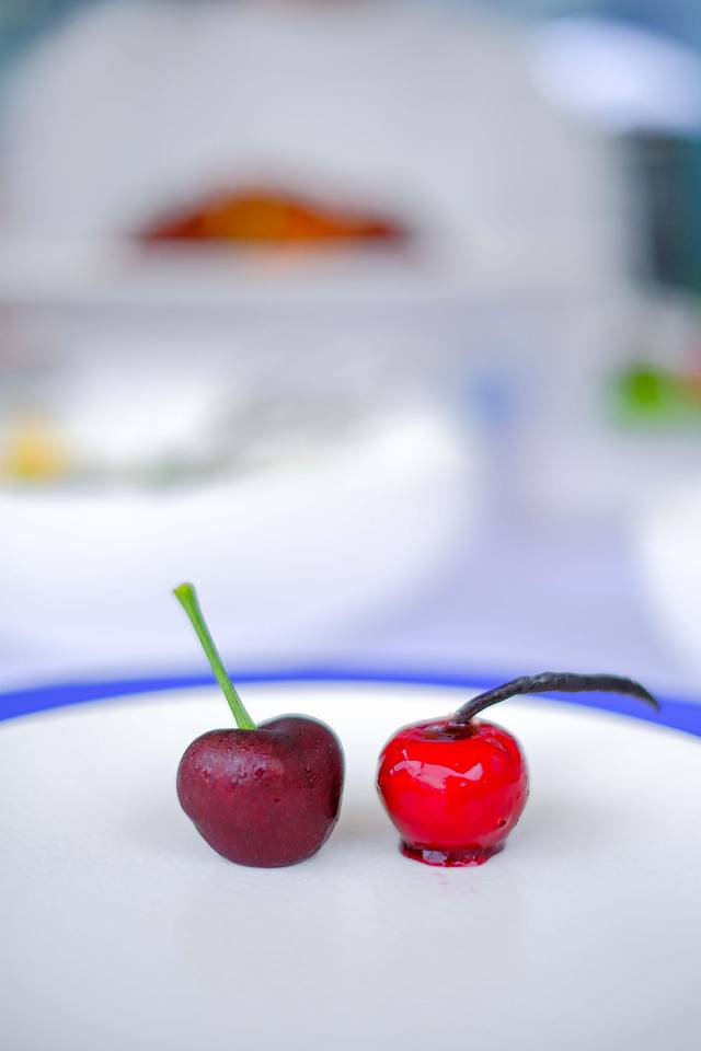 甜点:有印着品牌Logo的黑白棒棒糖和手工马卡龙,有带着经典卡尔黑框眼镜头像的蓝莓芝士塔,有橘色手袋样的马斯卡鹏柑橘蜜柚蛋糕;