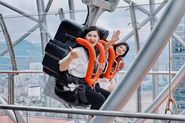 在城市云端之巅,将秋千荡向天空,脚底看到的就是山城两江四岸绝美风景!先体验失重带来的刺激感,再到慢慢放缓后的迎面拂过的高空微风,仿佛飞翔一般。