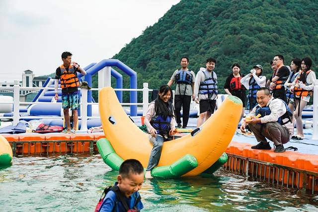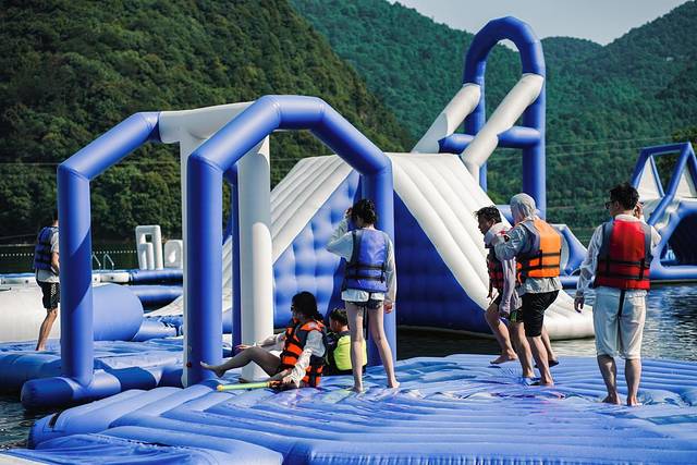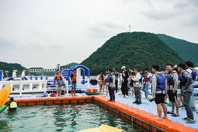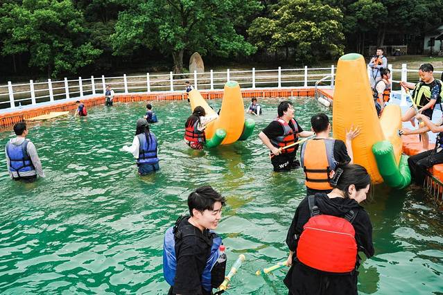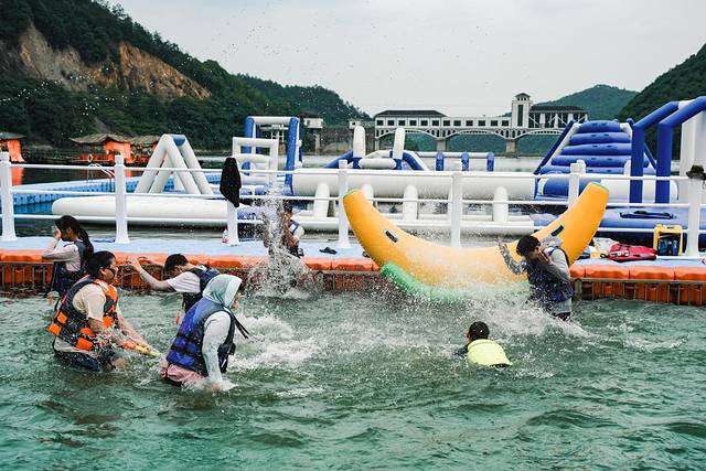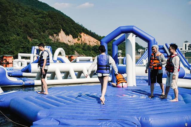 这是一个竞技类闯关游戏,由很多漂浮气垫搭建在水上的嬉水乐园,多项水上项目每一关都超级有趣味,也有需要队友配合完成的,所以也是团建的绝佳选择。