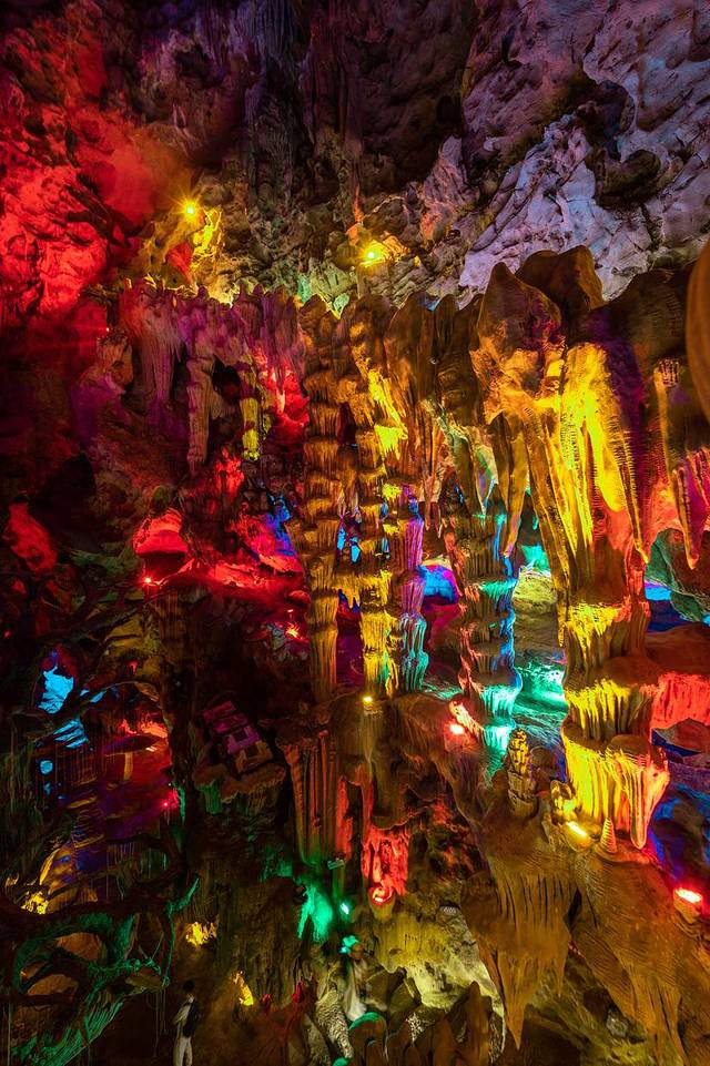 为了增添游览氛围,洞穴中还特别添加了很多五彩斑斓的灯光设计,打到神态各异的钟乳石上,更加神秘梦幻了~