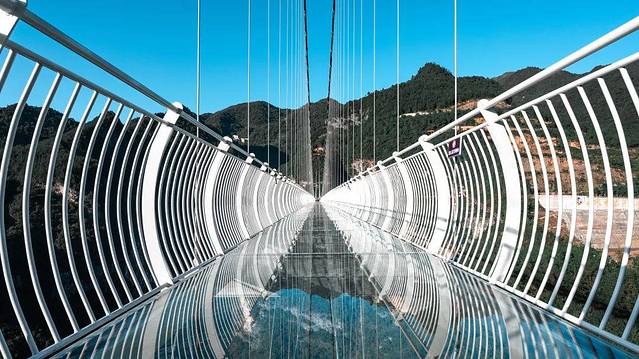 一座玻璃桥横穿万丈深谷,直通险峻山峰,视觉上特别震撼。