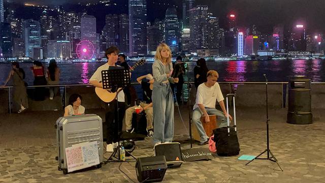 来到码头坐天星小轮,到维港看夜景拍照,码头有很多人在驻唱,唱得都很好听,夜景+驻唱=几有feel!