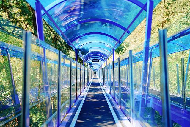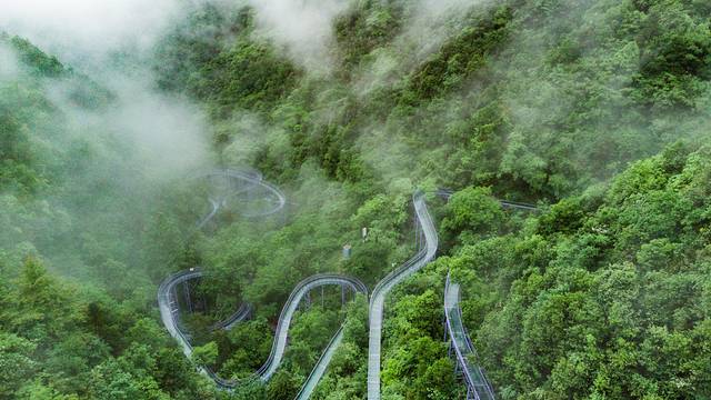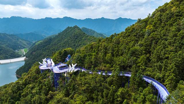 这里的漂流曾拿过全球最长通体玻璃漂流的世界纪录。远远望去,一路蜿蜒直达远方,宛如两条飘带,其长度达到了3.5公里,紫色的钢架和透明的玻璃是撑起起身躯的重要元素,从上而下蜿蜒下来,落差达251米,可以说是惊险又刺激。