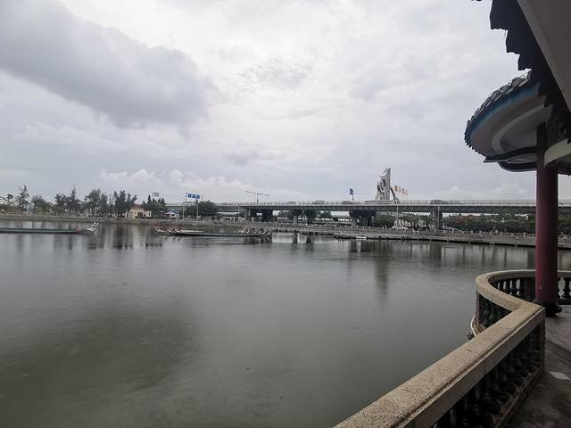 在往前走就是龙舟池,龙舟池还是很大的,龙舟静静的停在池面上,还下起了小雨。