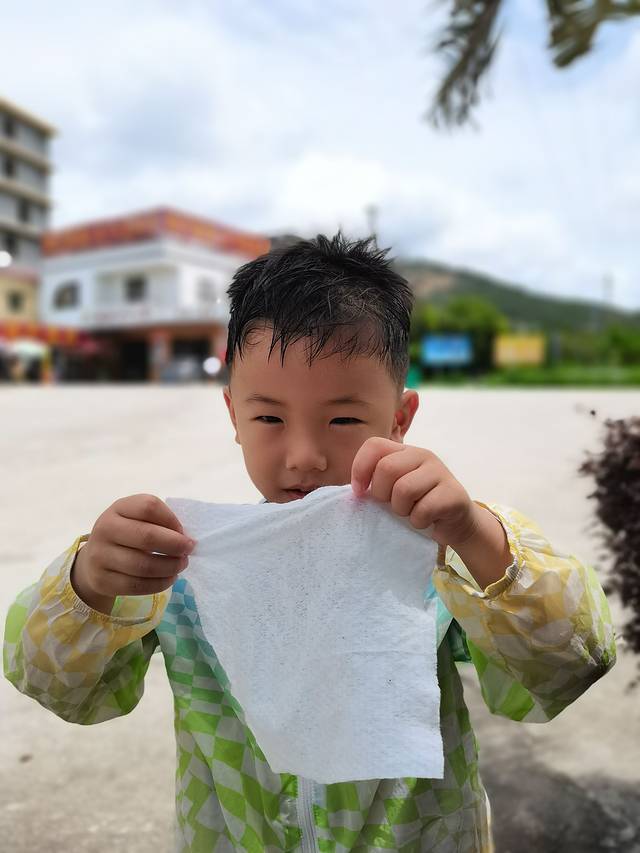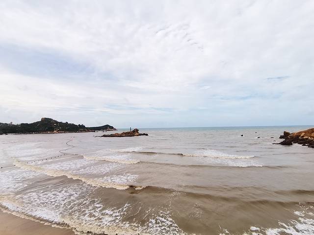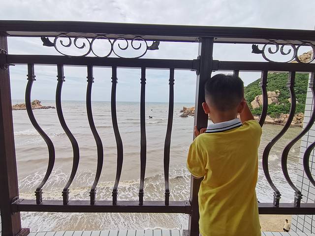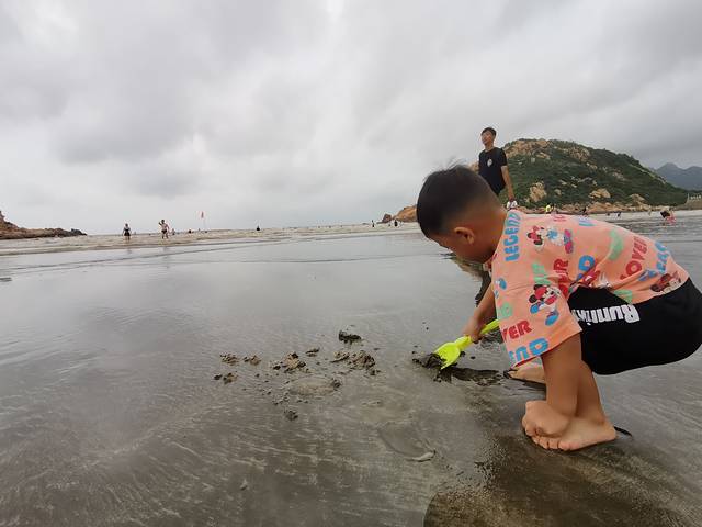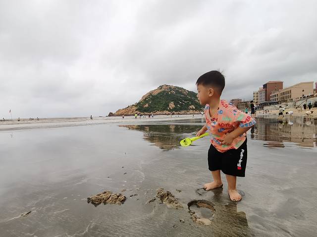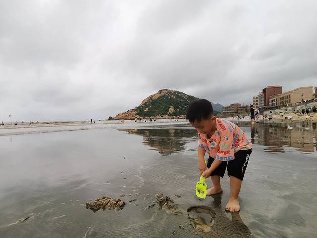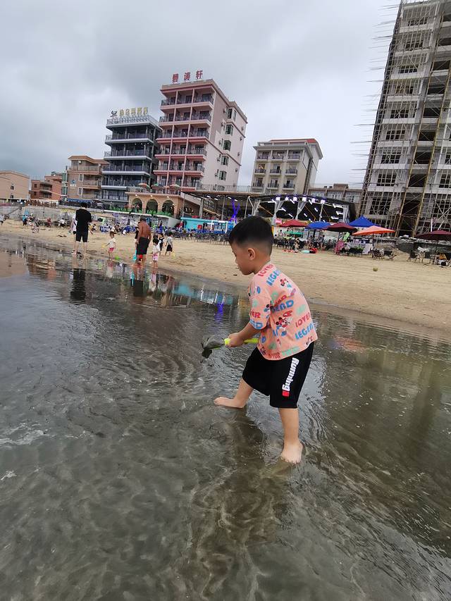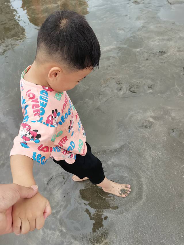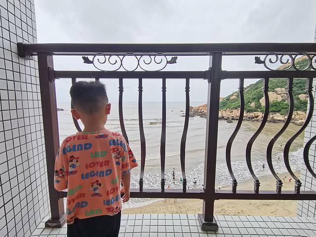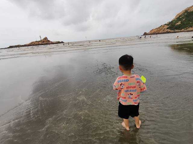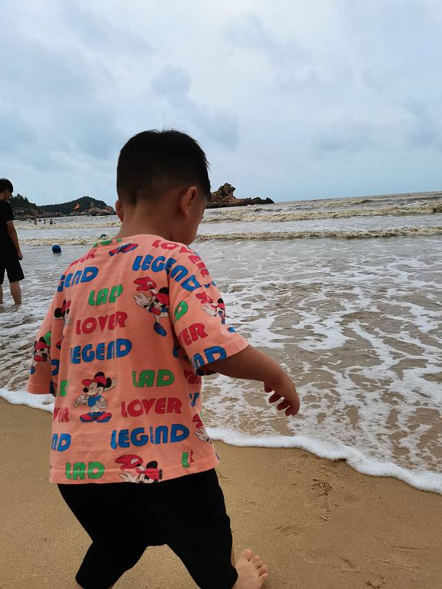 17:35,不想再去考虑民宿的性价比,随缘选了一家民宿,一间靠海的房间。旅途的劳累让小家伙生出的一些小情绪在这个时候通通烟消云散,迫不及待的脱掉鞋袜,拉着我的手就要向大海和沙滩飞奔而去。