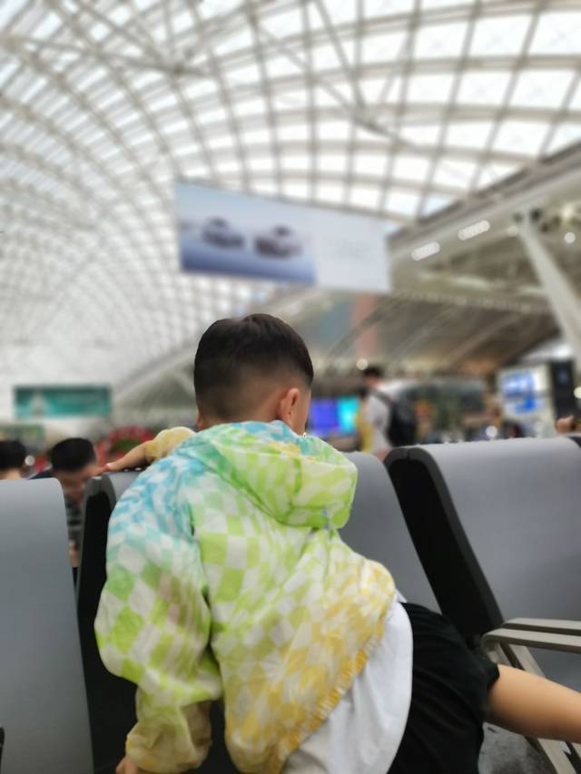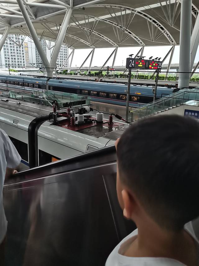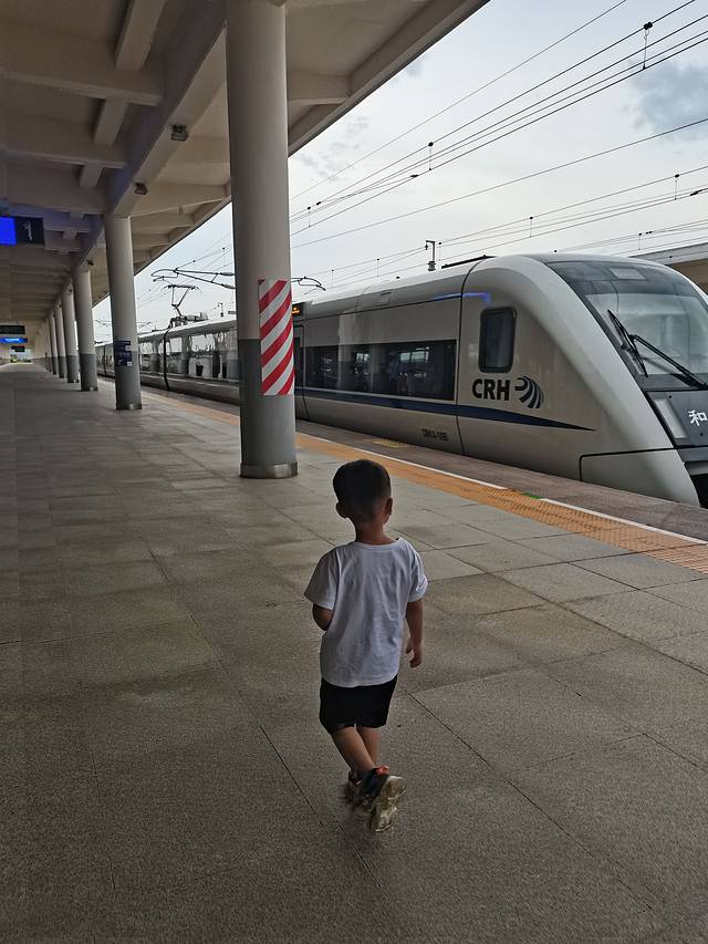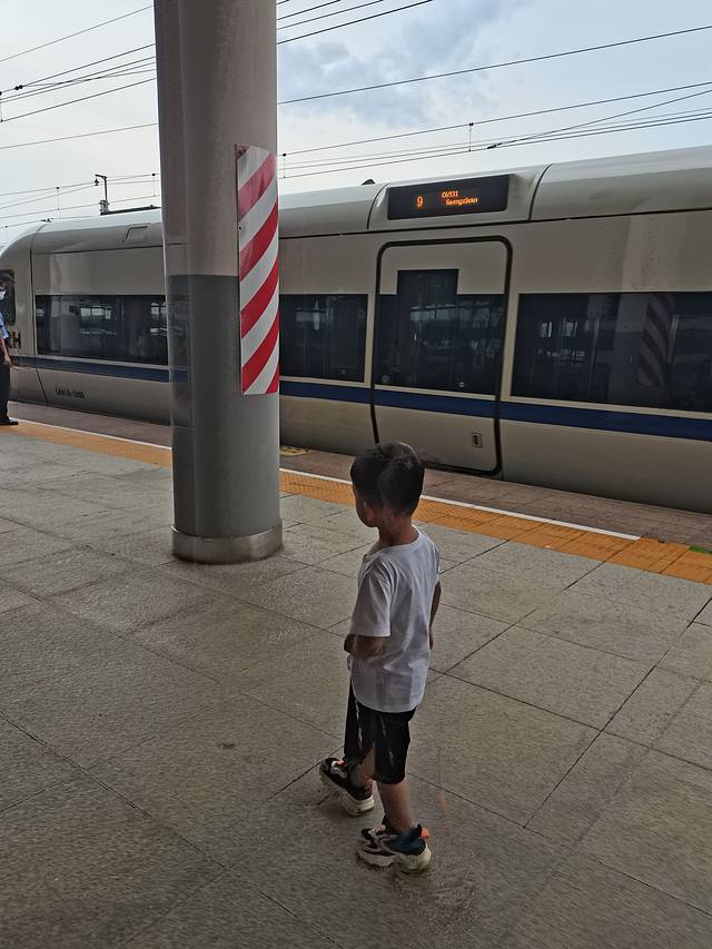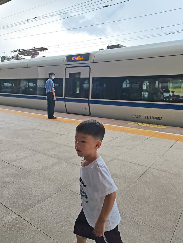 12:30。进站上车,看到了他喜欢的蓝色高铁,看得目不转睛。