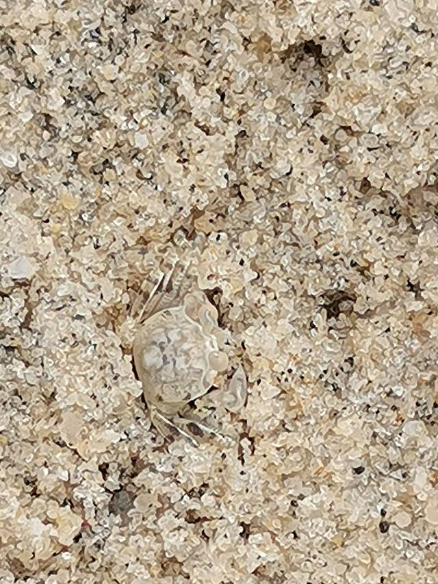 经过一夜,沙滩上留下无数的螃蟹洞,大大小小的。