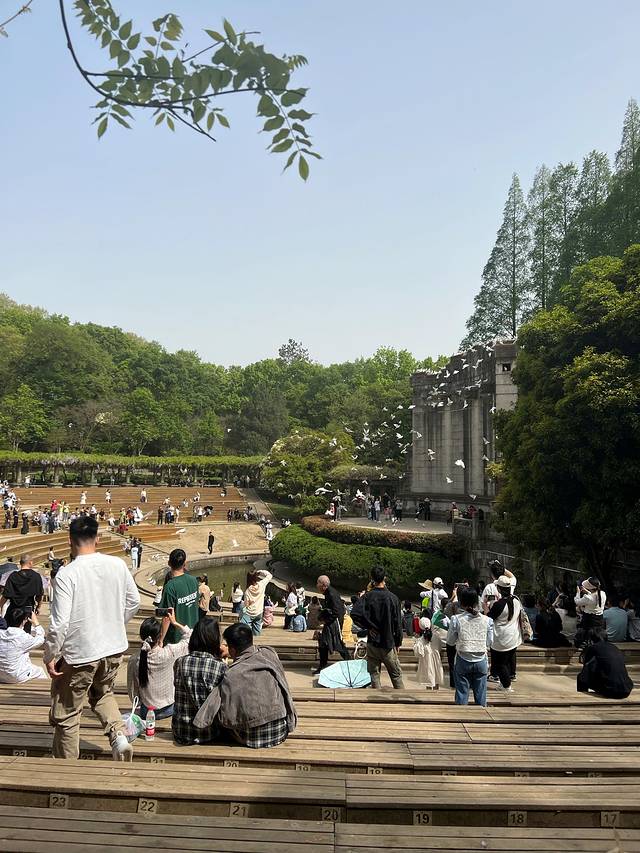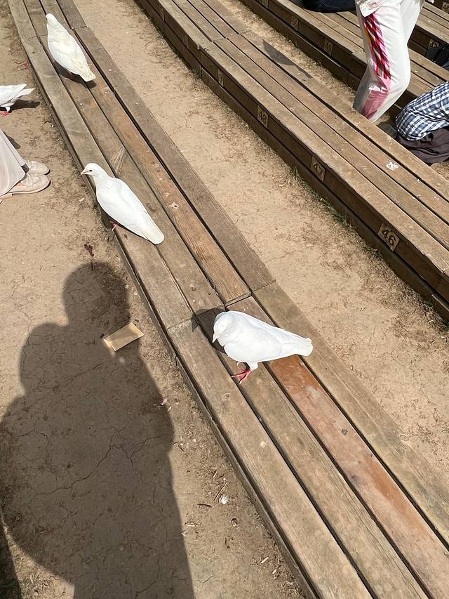 突然有音乐声响起,全场鸽子都飞到右前方石牌顶上~超壮观!