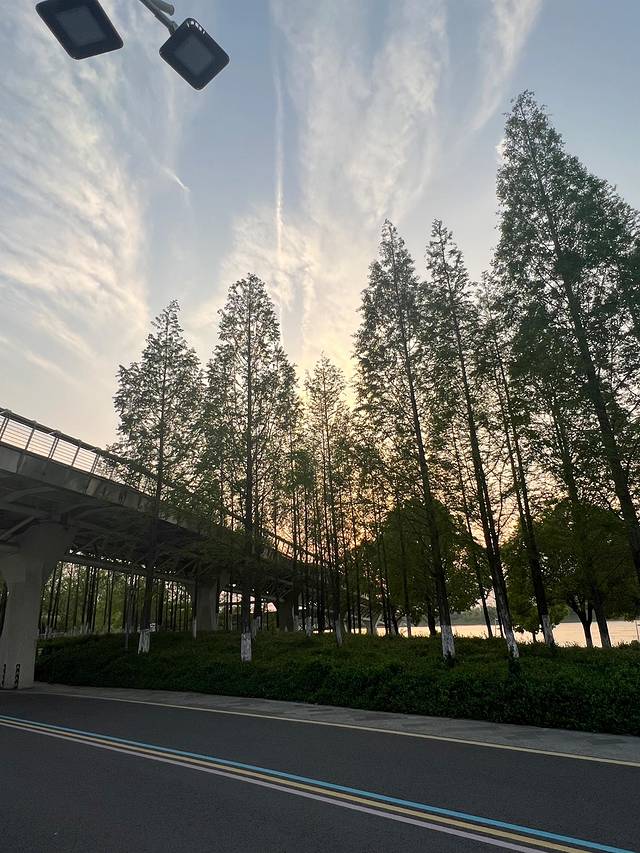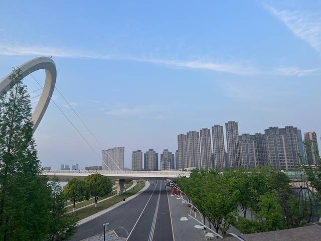 准备走上步行桥。距离观景廊有些距离,边走边感慨江滨岸的绿化之美。