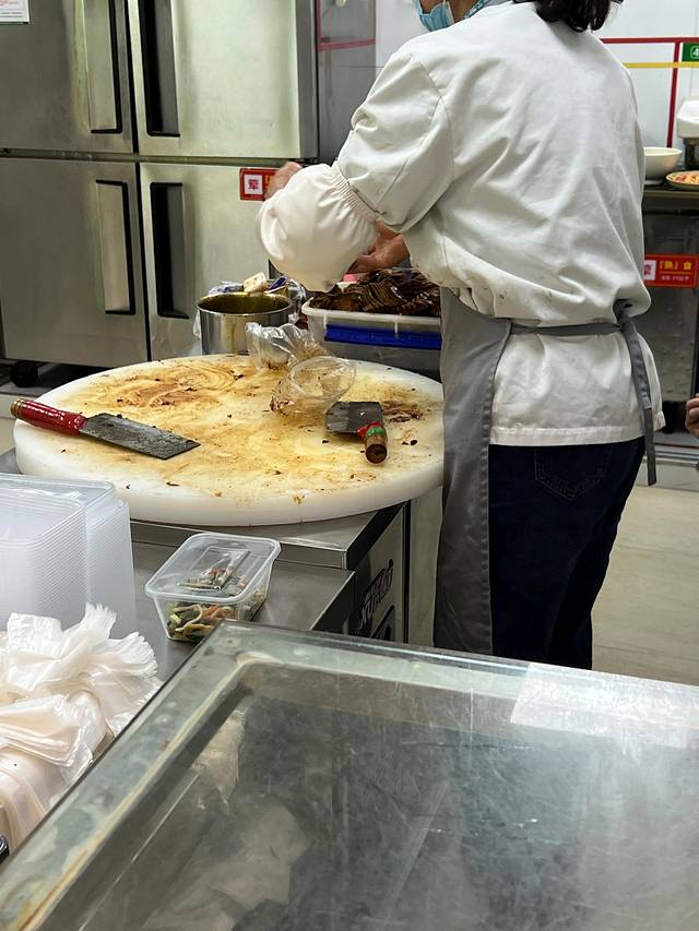 李记清真馆到达!我先去排收银台买锅贴票,妈妈排领锅贴,然后把票子给妈妈。中午1点人流量不算很多(收银台排15人,锅贴排50\60人)。图上是我在买卤味~卤味窗口人更少。想想清明前2周,是挤不进去店里的那种程度~