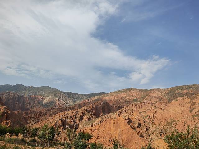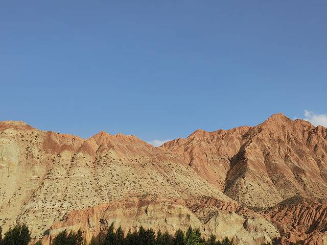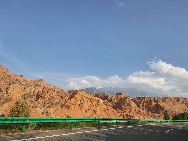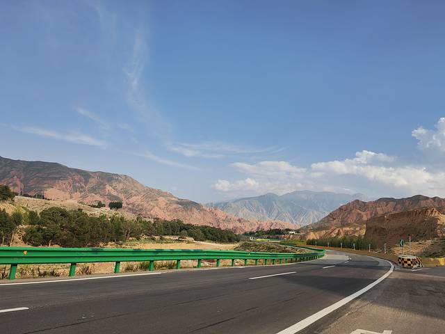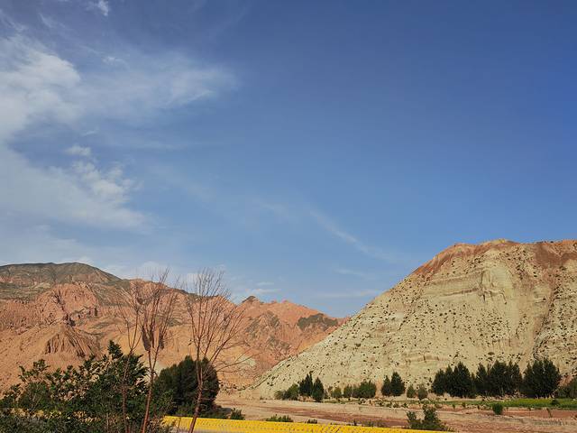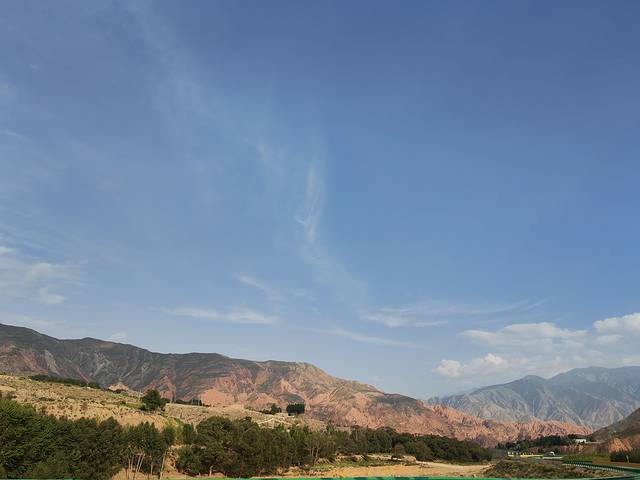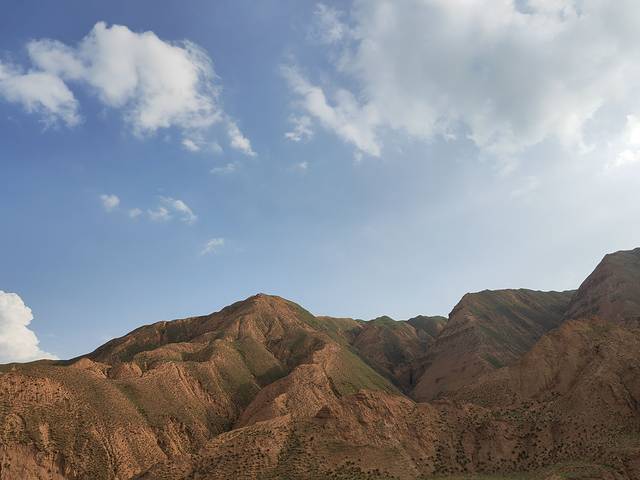 去贵德的高速上,青青草原一点一点退化,突然一抬头就发现高速两边地貌发生了翻天覆地的变化,这不就是丹霞地貌么?恰好一个弯道过去,太阳冲破了云雾,天空完全放晴,落日的余晖倾泻在褐红色,蓝灰色与土黄色的山峰上,呈现出了金色,赤红色与淡青色,一道道粗细浅淡不均不规则横纹排列于两侧山体,映着蓝天白云与远处的青山,真是雄伟壮观,璀璨夺目,让人挪不开眼,高速上手机动态成像和广角实在是不行,别说眼里看到丰富多变的色彩了,就是七彩也没法拍出来[捂脸],怎么之前一点也不知晓西宁有丹霞地貌呢,实在是疏忽了~