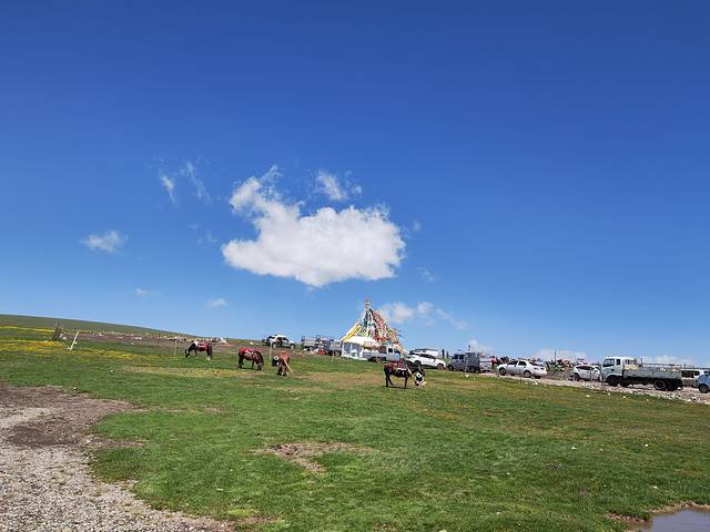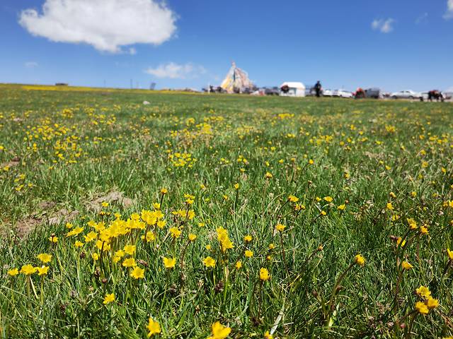 从塔尔寺出来,一路沿拉脊山盘旋而上,去程一直在云海里穿行,一群一群的牛羊也看的没那么清晰,到了山顶,顺着楼梯走到宗喀拉则的最高点,云雾缭绕仙气飘飘,风大的能把人吹走。下山途中,迷雾逐渐散去,突然发现这拉脊山牧区的羊都是彩色的,有蓝色,红色,褐色,白色,还有带花纹的。牧民区分羊群靠染发,真有创意!行至半山腰,天气逐渐转晴,视野更加清晰开阔,山谷里面一片一片油菜花还未盛放,约么还得十天半月吧,届时这里应该是最美的~