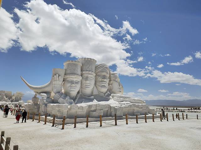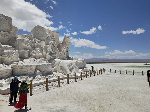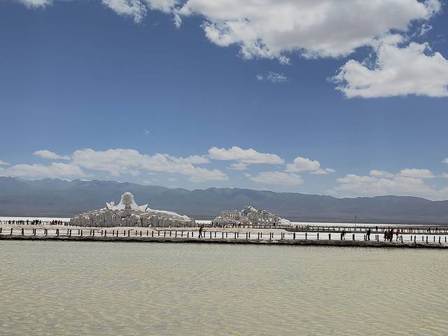 茶卡户外15℃左右,风贼大,能把人吹走~吃个午饭升几度,带俩小儿慢悠悠进去,再坐上那个比我们快不了多少的最慢最美小火车,到盐湖中心的时候没有刚到那么那么冷了,孩子们一路惊呼,知道要下湖里玩,超级开心。换上鞋套后发现,鞋套不适合妹妹或者更小的宝宝穿,太大了,平地尚且举步维艰,下了湖自己就走不了,还有这随时要把人吹走的风助阵,妹妹下去站都站不稳,自己也不方便挪步,走两步那个兴奋劲没了,安全感没了,就要上去,换成坐台阶上捡粗盐,越捡越开心,一捡两口袋,这要是钻石咱家早都发了[捂脸]。哥哥越玩越开心还要走到天梯或者小船那边玩,被强行喊回来,只能在我和妹妹附近玩,好在小孩都自来熟,不一会就找个伴,俩玩的不亦乐乎。等出茶卡的时候,小孩发现自己的手,衣服,裤子全变成白色的了[捂脸][捂脸][捂脸],玩的太嗨,这是要被茶卡盐化~