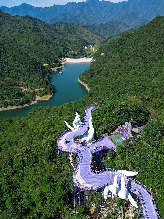 上帝视角俯瞰,滑道犹如紫色长龙盘旋在峡谷之间,曲回蜿蜒直达山谷深处,颇为壮观!立体式的玻璃漂流,由上顺势而下,乘着皮艇像是身在绿色海洋之中,穿梭于茂密丛林之间,弯多险急的S型玻璃栈道设计带给游客们惊险与刺激,肾上腺飙升的激情快感,在山谷间尖叫呐喊吧!