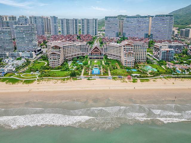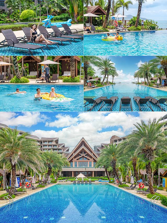 酒店户外设计颇具东南亚特色,位于儿童戏水池旁的栈道就是其中之一,两旁翠绿树丛、小桥流水,东南亚风情浓郁;无边泳池旁的栈道和露台也是拍照打卡的好地方,每一处各有一种风情,让您感受与别不同的酒店度假氛围;中央草坪两侧的林荫小道,以郁郁葱葱棕榈椰林为伴,金町湾的海滩为背景,走在林荫路上让人感受到假期的悠闲惬意。