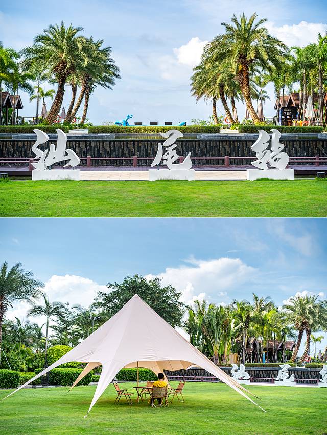 酒店户外中央草坪也是一大亮点。蓝天与草坪相映衬,背后为大海,是举办婚礼或举办派对的理想场所,也是户外露营的好地方。草坪上“汕尾站”的立牌更是非常特别的景观,成为到此打卡的又一名片。