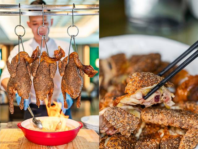 广府的特色名菜“脆皮鸡”,选用了优质清远鸡,搭配虎纹奇亚籽上皮风干,再吊烧八成熟,然后放入油锅中炸至古铜色,皮脆肉嫩,滋味无穷,吃过都会令人上瘾!