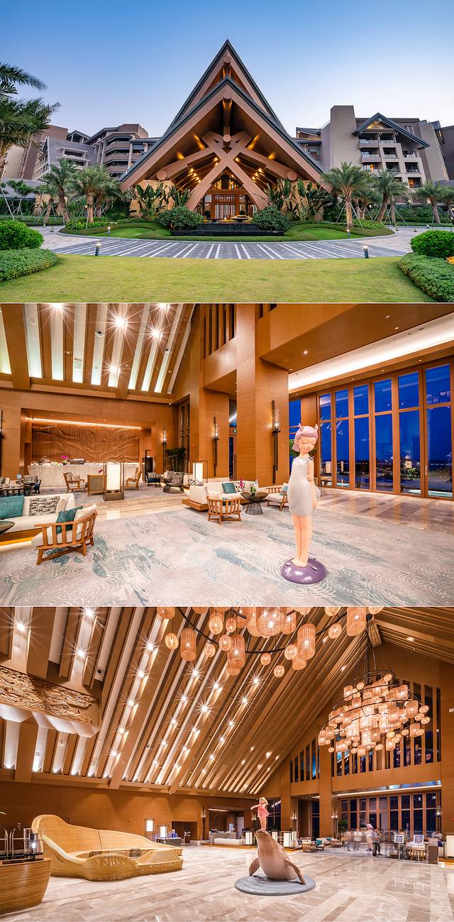 运用了当地海渔文化元素设计的绿洲大堂吧,令人印象深刻,站在鲸鱼上的女孩和吹着海风的龙女,都能让人感受到自然清新的渔文化,带给宾客与别不同的海洋风情。