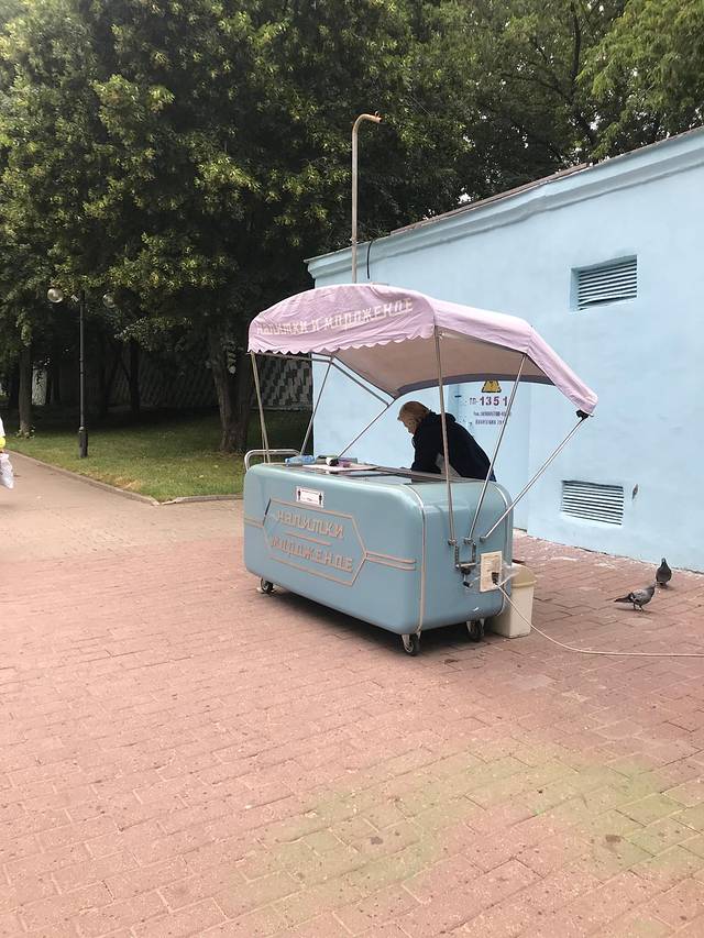 冰淇淋:第一个芒果口味甜筒190卢布,合人民币19元,国内就是天价的。在夏宫门口的餐饮店买的。第二个雪糕65卢布,是在圣彼得堡酒店附近唯一的超市买的,是我全程看到的最便宜的雪糕,类似国内脆皮雪糕。第三个在叶卡捷琳娜公园的冰淇淋推车买的,100卢布,味道还不错,也比较大。宜宾的许姐在火车站的连锁餐饮(类似麦当劳)买了一个香草味单球,150卢布,我吃了两口,不好吃,太甜。