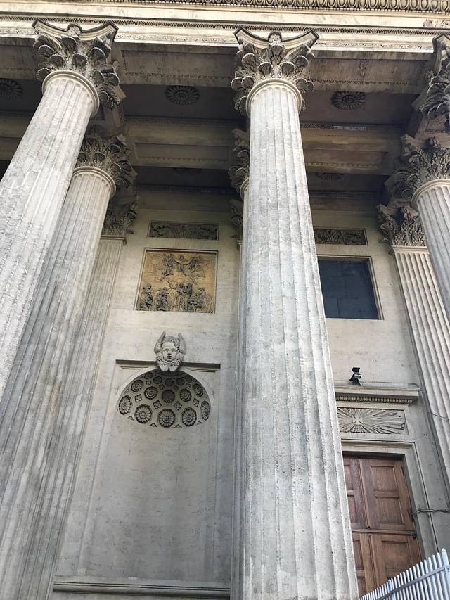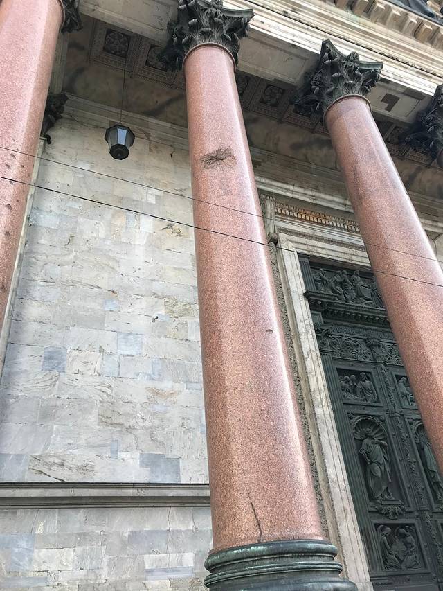 教堂四周各竖有16 根粗大的花岗岩石柱,成双排托起雕花山墙。每根石柱重114 吨,是从30 公里外的芬兰湾运来的。