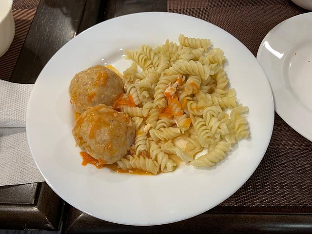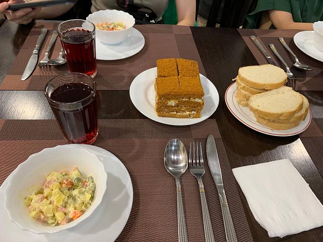 谢尔盖耶夫镇,俄式简餐:沙拉,汤,主食意大利面,果汁,面包片,蛋糕太甜了,这边甜食很多,欧洲人喜食。