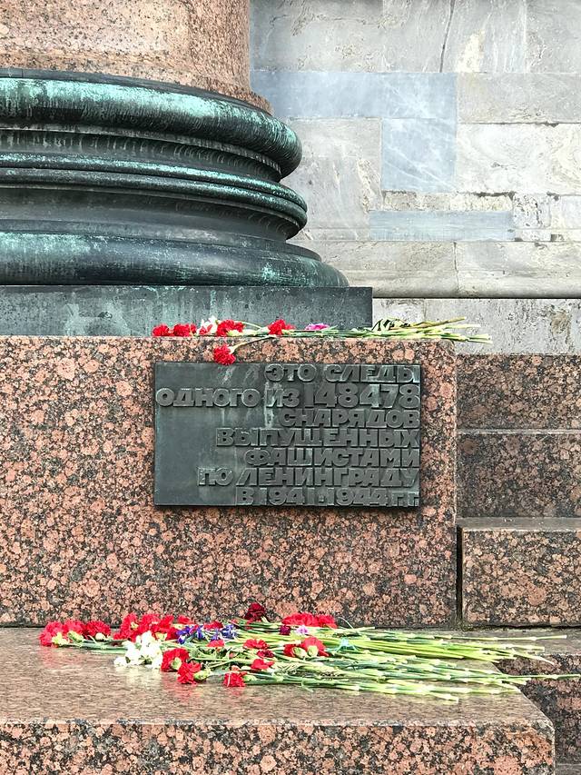 在第二次世界大战中,伊萨基辅大教堂受到严重损坏,20 年后才修复完毕,但留下教堂大门外的大理石柱子上的几处弹痕没有修补。在一根柱子旁挂着一块铜牌,上写:“这是在1941~1944 年,德国法西斯发射的148478发炮弹中其中一发留下的罪证。”