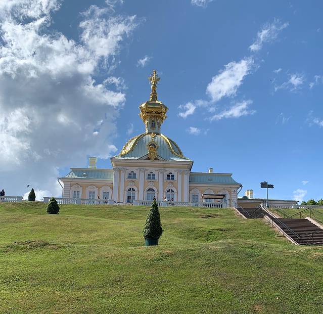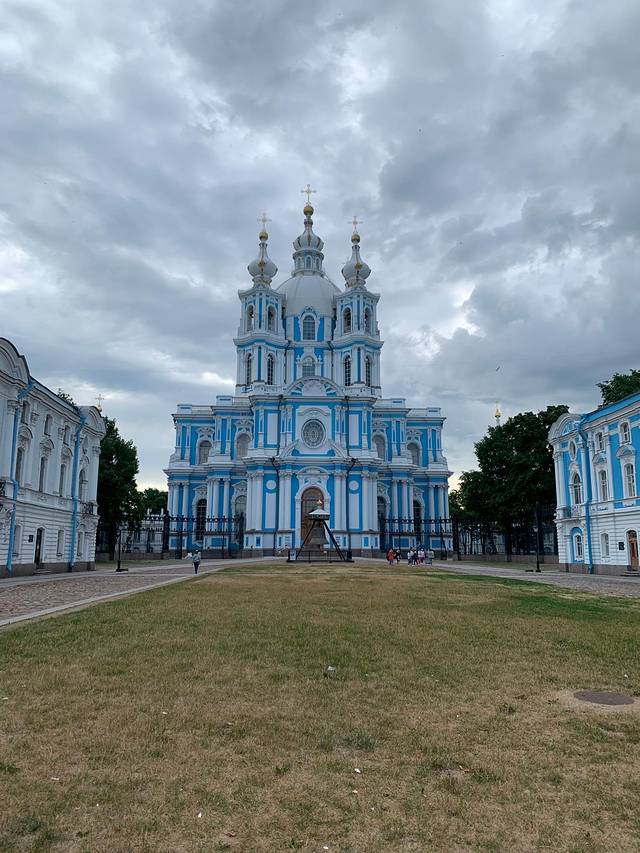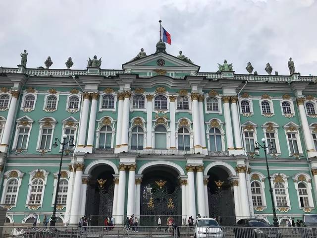 吃过早饭后到达景点还是早上不到七点。十月革命圣地。为拜占庭蓝白相间,是巴洛克风格和拜占庭风格的融合的建筑群。中间一座是教堂,四周环绕的目前是圣彼得堡市政府,从市长到各处、陆军部、内务部在此办公。