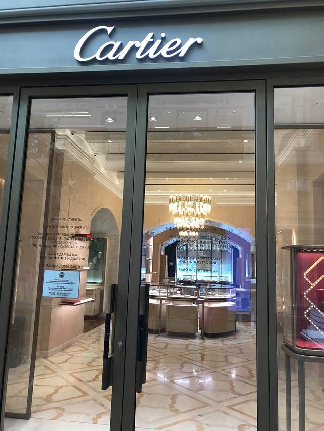 由于俄乌战争导致俄罗斯受到制裁,经济不景气,很多大品牌都撤柜了。图为卡地亚店铺已撤柜。